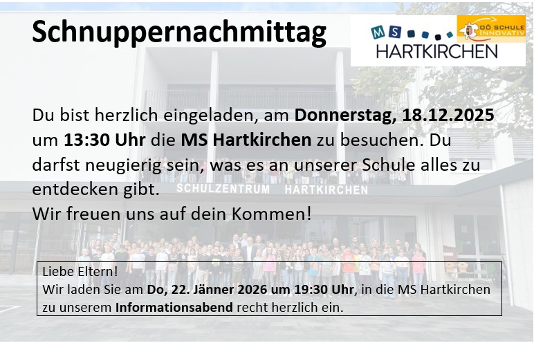 Die Kinder aus Hartkirchen, Aschach und Haibach laden wir, wie gewohnt, gemeinsam mit ihren Lehrerinnen am Mittwoch, 17.12.2025 zu einem Schnuppervormittag ein. Die Einladungen dazu werden zeitgerecht in Papierform an die Kinder ausgeteilt.